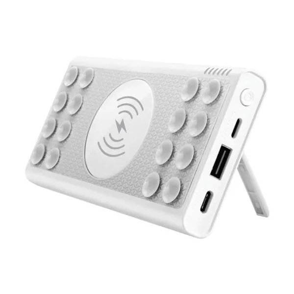 Ultra-slim 10000mAh power bank with strong suction pads for convenient wireless charging.